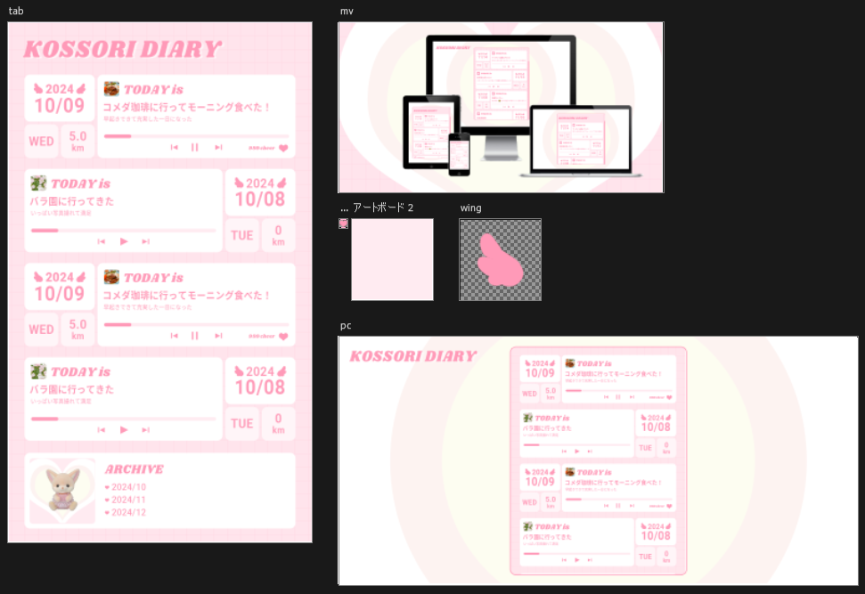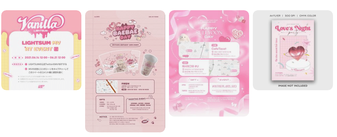デザインは、韓国のアイドルやファッション系バナーに見られる、レトロ感がありながら区切りのはっきりしたレイアウトを参考に設計しました。