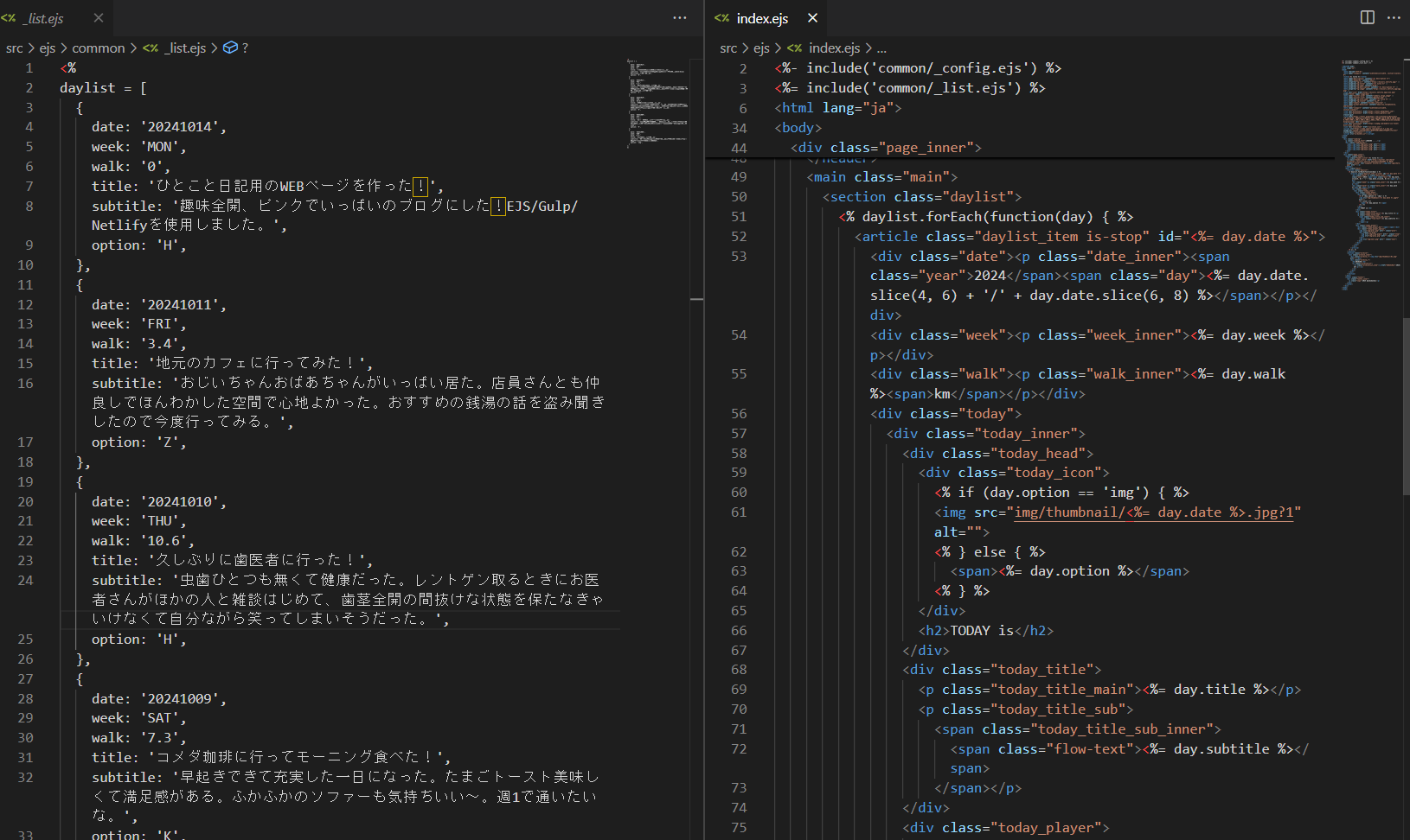 「気軽に続けられる日記」というコンセプトを実現するため、日記データを配列として管理し、EJSを用いてテンプレート化する構成を採用しました。記述した内容をコンパイルすることで、静的なWebページとして表示される仕組みを構築しています。